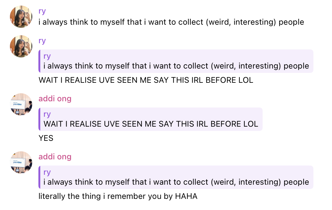 this is not a sentiment i talk about a lot, but it is something that i am always thinking about. i am driven, mostly, by the friends that i make. i confess that i do not care much for big picture themes like community or innovation or environmentalism, though i agree that these are all important; but i am personally most compelled by individuals. beyond my personal creative endeavours, which mostly feel like a service to myself and my self expression, there is not much i want to do with the world other than seek connection. not as a means to an end! i’m not even very sure why this compels me so. somehow i find great joy in watching these people move through the world, and seeing the work they produce and the change they effect, and i just want to be there to bear witness to it all…!