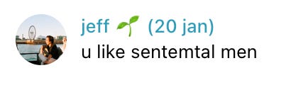 over the years i’ve been drawn, repeatedly, to people who are demonstrably sensitive (and sentimental!) online. some of them have become my dearest friends; i like to jokingly call them my “victims”1. the process of befriending has often gone something like this: